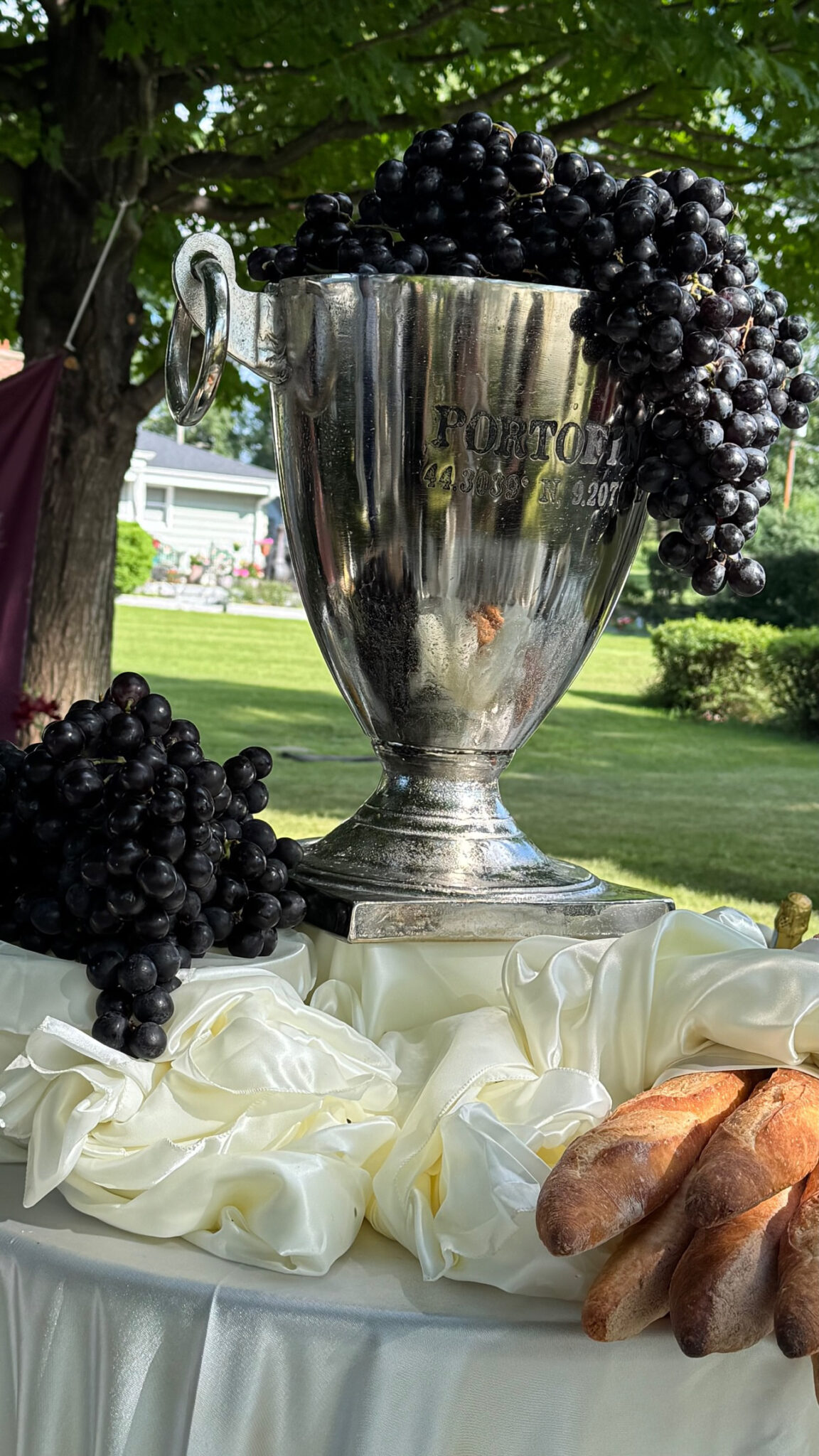 After the nuptials, guests were welcomed into a lively cocktail hour that felt more like an experience than a transition. Interactive foodscapes invited guests to mingle and indulge, while live musicians set an elegant yet energetic tone. At the center of it all was a striking display by Events by Manna—an abundant spread of oysters, caviar bumps, artisanal bread and butter, and clusters of Concord grapes—designed to feel indulgent and tactile. Specialty cocktails, a portrait backdrop, and a cozy lounge offered guests a chance to sip, unwind, and take in the moment. The bride mingled with guests, carrying her second bouquet of the evening—a bold arrangement of red anthuriums and amaranthus that offered a glimpse into the evening’s evolving color palette.