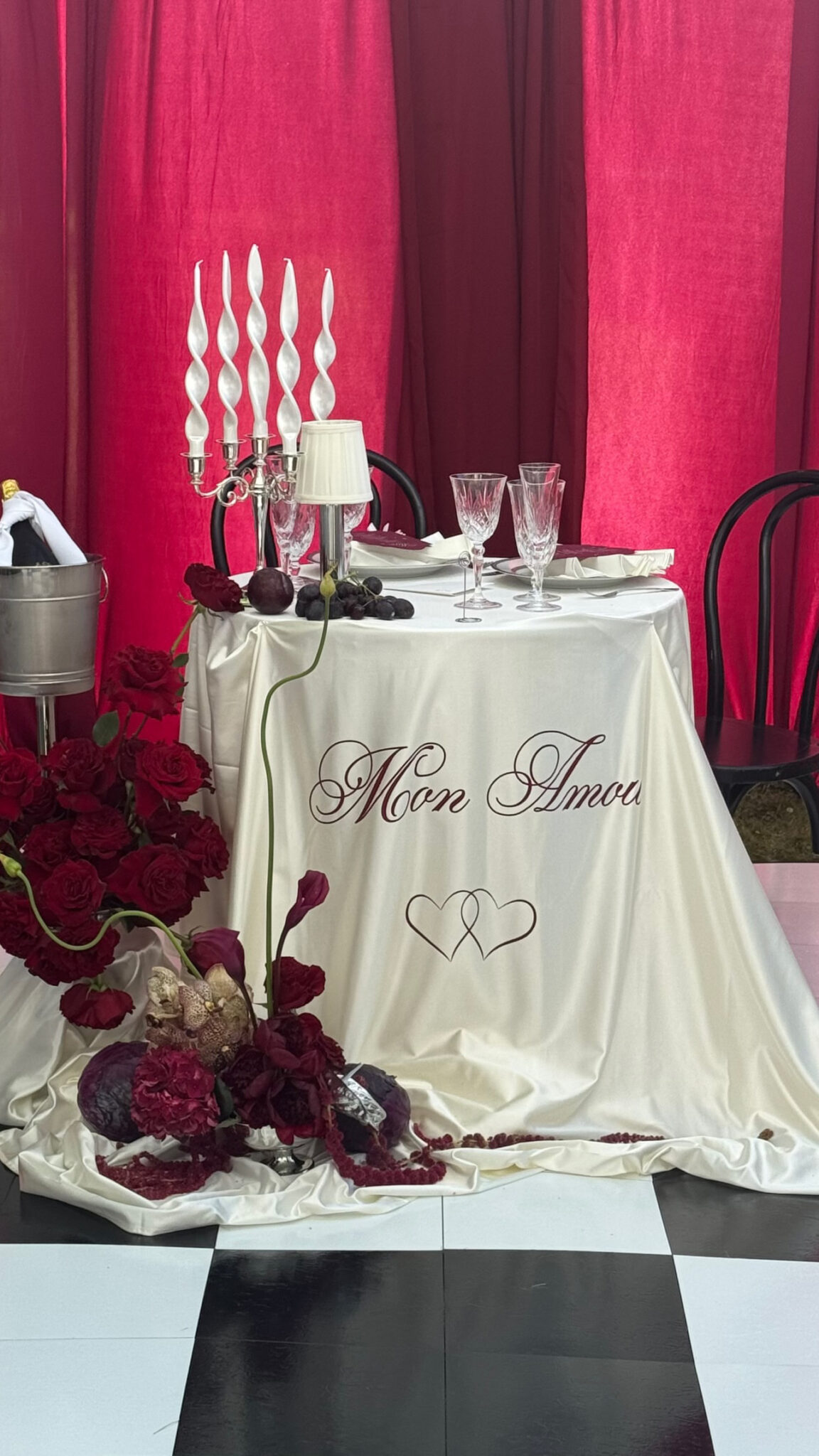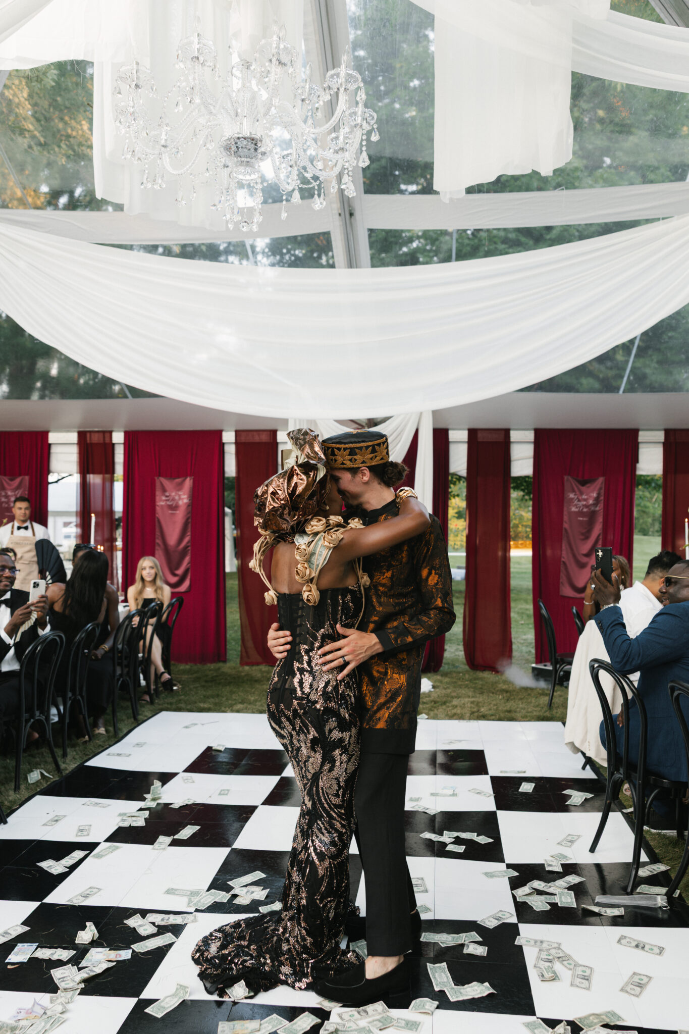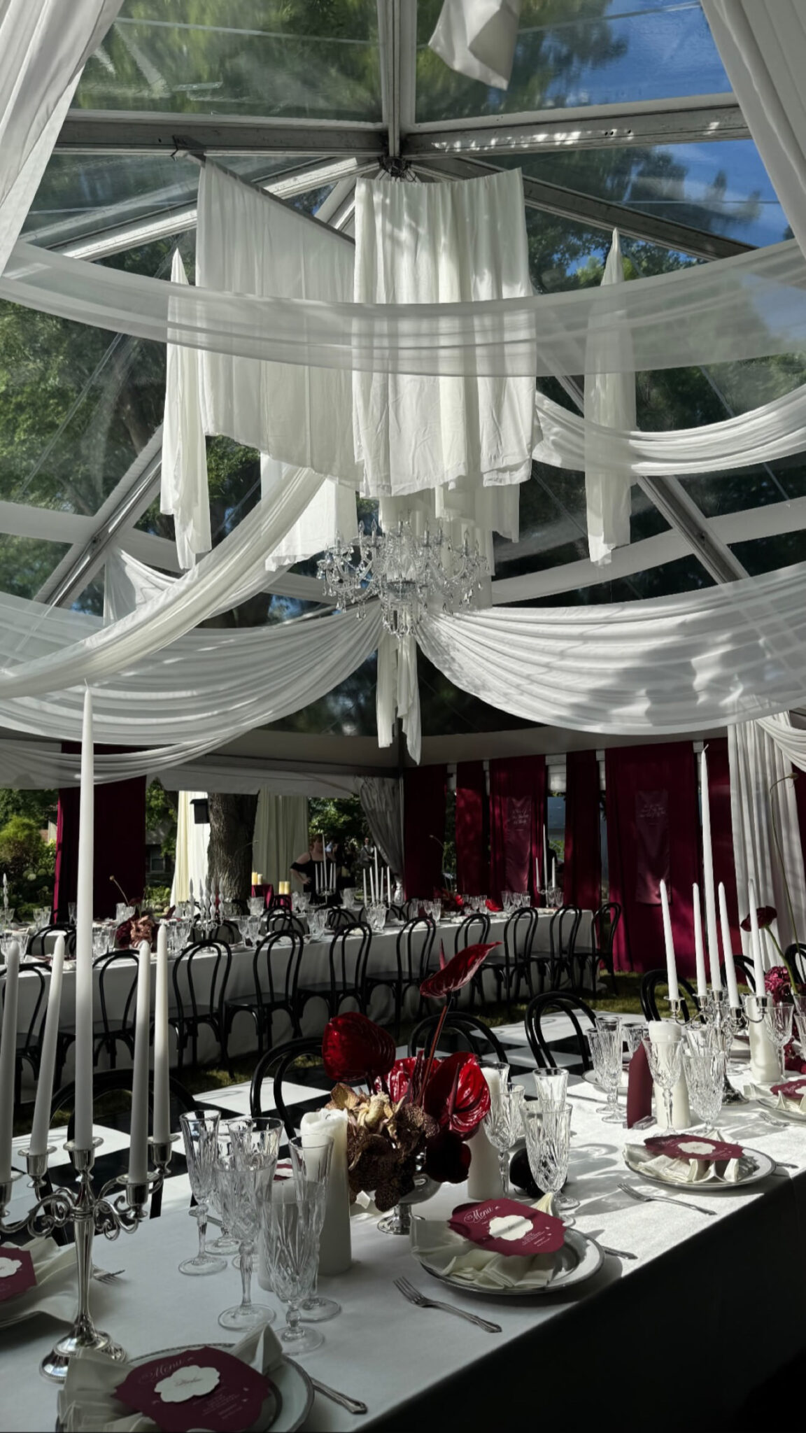 For dinner, guests were invited into a clearspan tent designed to feel warm and intimate, with ethereal draping overhead and a sculptural chandelier installation suspended above the dance floor. Each place setting featured a custom accordion-folded napkin—meticulously pressed by our team over the course of ten hours—to accompany the bride’s floral arrangements of deep burgundy and red calla lilies, garlic scapes, anthuriums, amaranthus, and roses. Dramatic taper candles added verticality and depth, their flickering light intertwining with the soft draping above.