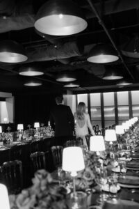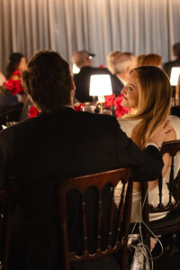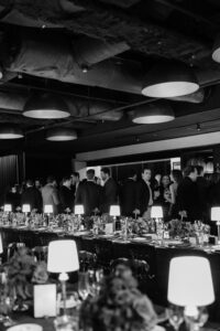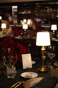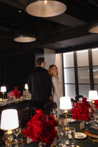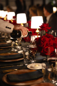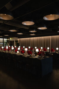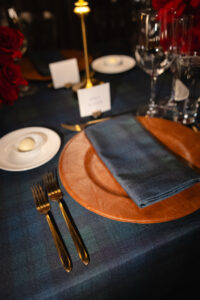 Leather charger plates added a rich, tactile element to each place setting, while custom-printed Blackwatch patterned linens brought depth and sophistication to the tables. Monobloom red rose arrangements added a pop of deep color to the masculine palette, and gold accents caught the warm glow of table lamps, creating an intimate and inviting atmosphere.